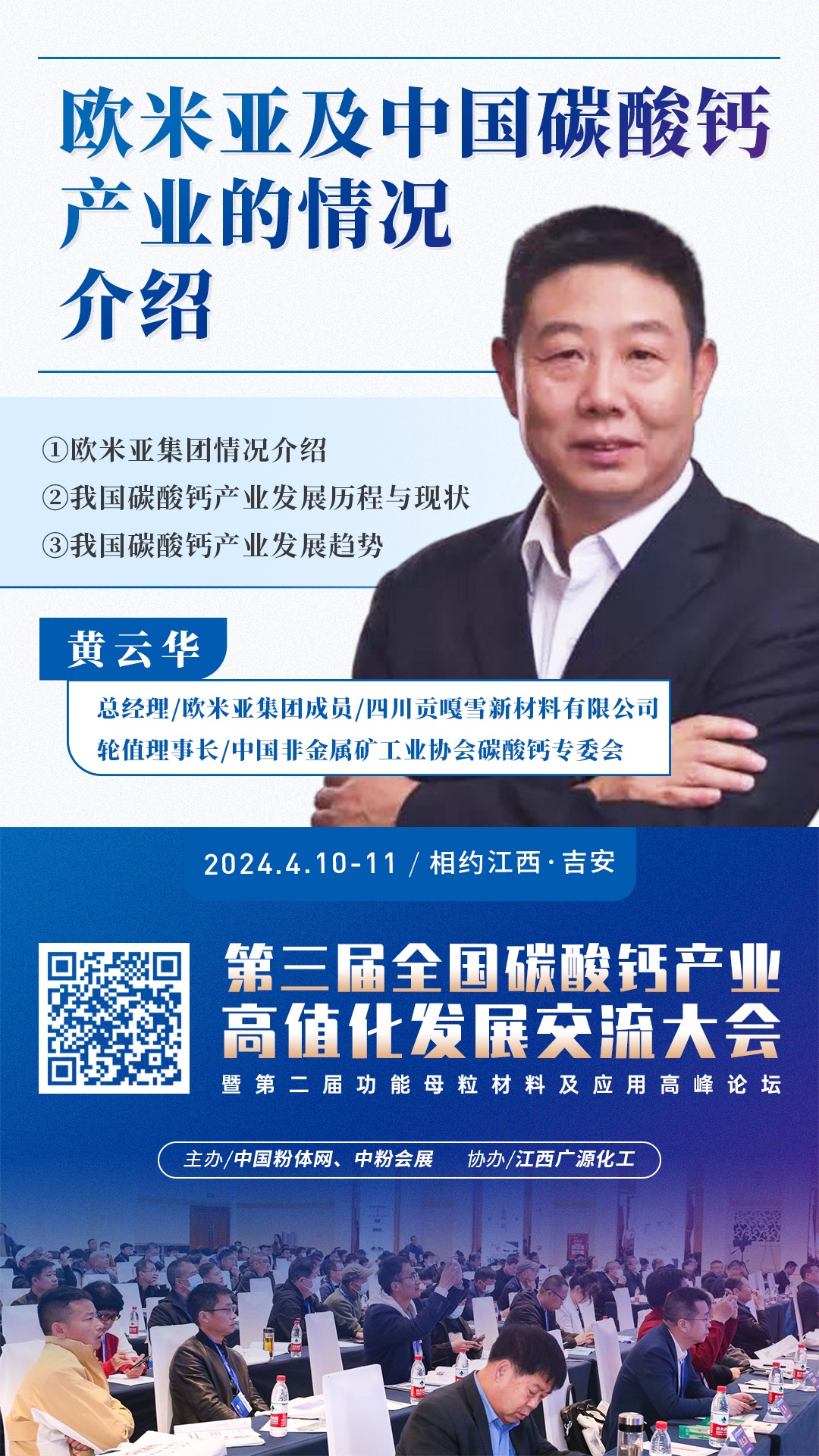 2024年4月10日~11日,第三屆全國碳酸鈣產業高值化發展交流大會將在江西·吉安舉行,屆時歐米亞集團四川貢嘎雪新材料有限責任公司總經理黃云華將在大會上作《歐米亞及中國碳酸鈣產業的情況介紹》主題報告,介紹瑞士歐米亞集團以及我國碳酸鈣行業發展的歷程及發展現狀。
