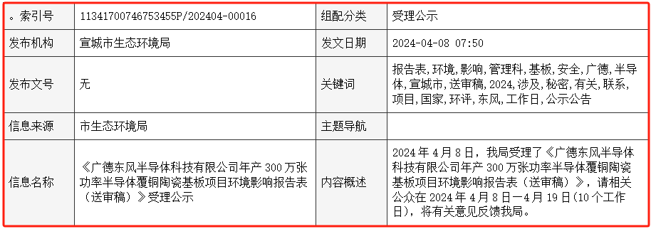 中國粉體網(wǎng)訊 4月8日,宣城市人民政府網(wǎng)發(fā)布《廣德東風半導體科技有限公司年產(chǎn)300萬張功率半導體覆銅陶瓷基板項目環(huán)境影響報告表(送審稿)》受理公示。