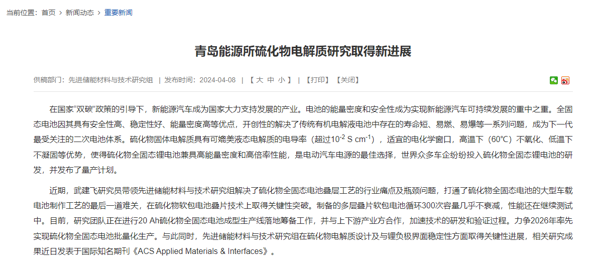 中國粉體網(wǎng)訊 自4月9日廣汽埃安旗下昊鉑品牌宣布將于4月12日發(fā)布“昊鉑全固態(tài)電池”后,4月10日,中國科學院青島生物能源與過程研究所(簡稱:中科院青島能源所)也發(fā)布消息,稱研究所先進儲能材料與技術研究組在硫化物電解質研究取得新進展,解決了硫化物全固態(tài)電池疊層工藝的行業(yè)痛點及瓶頸問題,打通了硫化物全固態(tài)電池的大型車載電池制作工藝的最后一道難關,在硫化物軟包電池疊片技術上取得關鍵性突破。