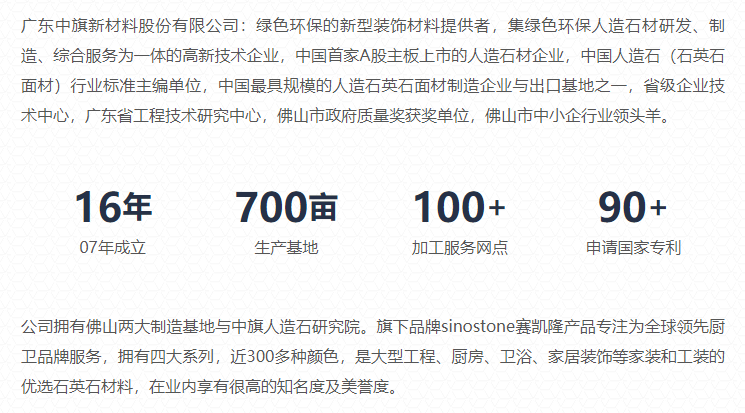 廣東中旗新材料股份有限公司:綠色環保的新型裝飾材料提供者,集綠色環保人造石材研發、制造、綜合服務為一體的高新技術企業,中國首家A股主板上市的人造石材企業,中國人造石(石英石面材)行業標準主編單位,中國最具規模的人造石英石面材制造企業與出口基地之一,省級企業技術中心,廣東省工程技術研究中心,佛山市政府質量獎獲獎單位,佛山市中小企行業領頭羊。