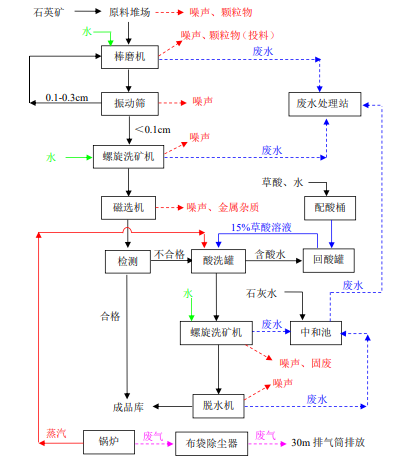 擬建項目以石英礦、草酸、石灰、聚丙烯酰胺、聚合氯化鋁等為原料,通過濕法球磨、篩分、螺旋洗礦、磁選、半成品檢測、酸洗、清洗、脫水、成品貯存等工序生產光伏玻璃砂。擬建項目建成后將形成日處理200噸,年產 60 萬噸光伏超白石英砂,新增就業崗位50個的規模。
