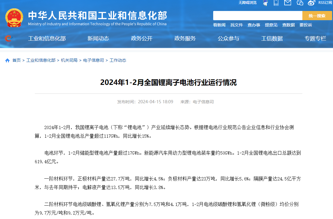 中國粉體網(wǎng)訊 4月15日,工信部發(fā)布2024年1-2月全國鋰離子電池行業(yè)運行情況,我國鋰離子電池(下稱“鋰電池”)產(chǎn)業(yè)延續(xù)增長態(tài)勢。根據(jù)鋰電池行業(yè)規(guī)范公告企業(yè)信息和行業(yè)協(xié)會測算,1-2月全國鋰電池總產(chǎn)量超過117GWh,同比增長15%。
