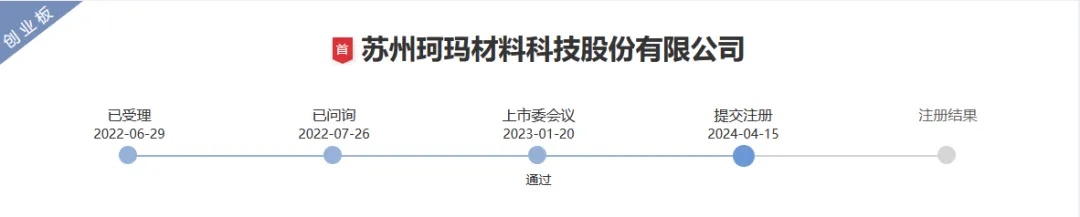 資料顯示,珂瑪科技申報(bào)創(chuàng)業(yè)板上市并于2023年1月20日成功過會,在苦等450多天,2024年4月15日提交注冊。
