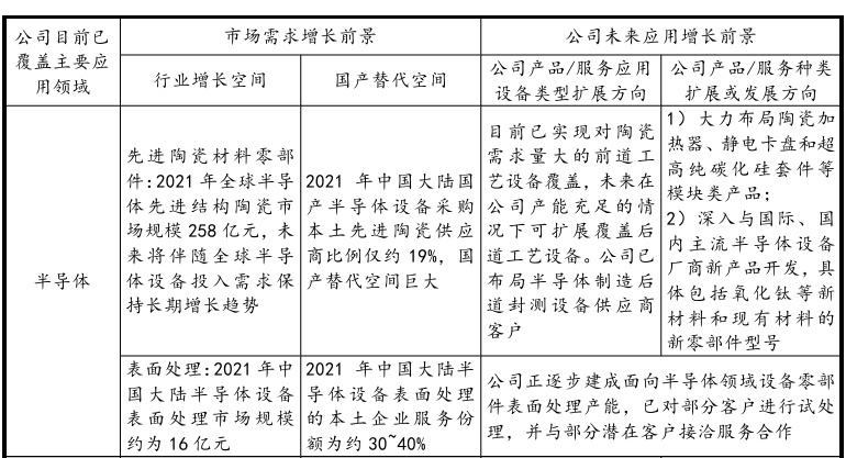 珂瑪科技氧化鋁、氮化鋁等先進(jìn)陶瓷材料零部件產(chǎn)品憑借優(yōu)良的綜合性能在刻蝕、薄膜沉積、離子注入、光刻和氧化擴(kuò)散等半導(dǎo)體制造前道工藝關(guān)鍵設(shè)備中得到了大量應(yīng)用,并隨著客戶需求的增長,半導(dǎo)體領(lǐng)域收入占比整體呈現(xiàn)逐年上升的趨勢。在半導(dǎo)體領(lǐng)域,珂瑪科技將在保持已有產(chǎn)品、技術(shù)優(yōu)勢的基礎(chǔ)上,擴(kuò)展覆蓋后道工藝設(shè)備,并繼續(xù)大力布局陶瓷加熱器、靜電卡盤和超高純碳化硅套件等高附加值、高技術(shù)難度的模塊類產(chǎn)品,以及氧化鈦和超高純碳化硅等新材料開發(fā),持續(xù)完善自身產(chǎn)品矩陣,與國際、國內(nèi)主流半導(dǎo)體設(shè)備廠商針對新產(chǎn)品開發(fā)深入合作。