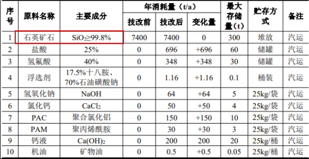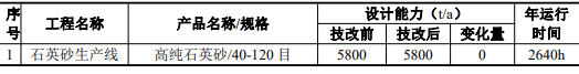 該項目以純度為99.8%的石英礦石為原料,生產高純石英砂,但技改后的具體純度是多少,尚未透露。技改后工藝為:石英石→粗破→焙燒→水淬→制砂一篩分→磁選→酸洗(在反應釜中酸洗)→水洗→浮選脫水→烤砂→篩分→磁選→包裝入庫:同時對現有公用工程進行適應性技術改造,建設污水處理站;生產廢水經過處理達標后接入工業污水處理廠。該項目建成后可形成年產5800噸石英砂的生產能力,產能不變。