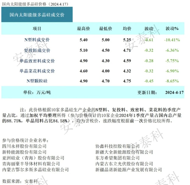 n型料成交價格最低為5.00萬元/噸,最高為5.40萬元/噸,成交均價為5.25萬元/噸,環比下跌10.41%。