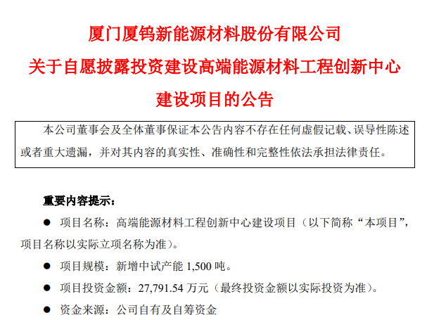 中國粉體網訊 4月18日,廈鎢新能發布公告,宣布計劃投資2.78億元,新建一座高端能源材料工程創新中心建設項目。本項目建設完成后,將新增正極材料等產品中試產能1500噸,主要應用于3C消費電子、車載動力、儲能等領域。