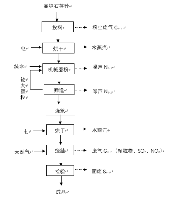 石英碇②采用石英砂→烘干→機械粉磨→篩選→澆筑→烘干→燒結→檢驗→包裝等工藝流程。