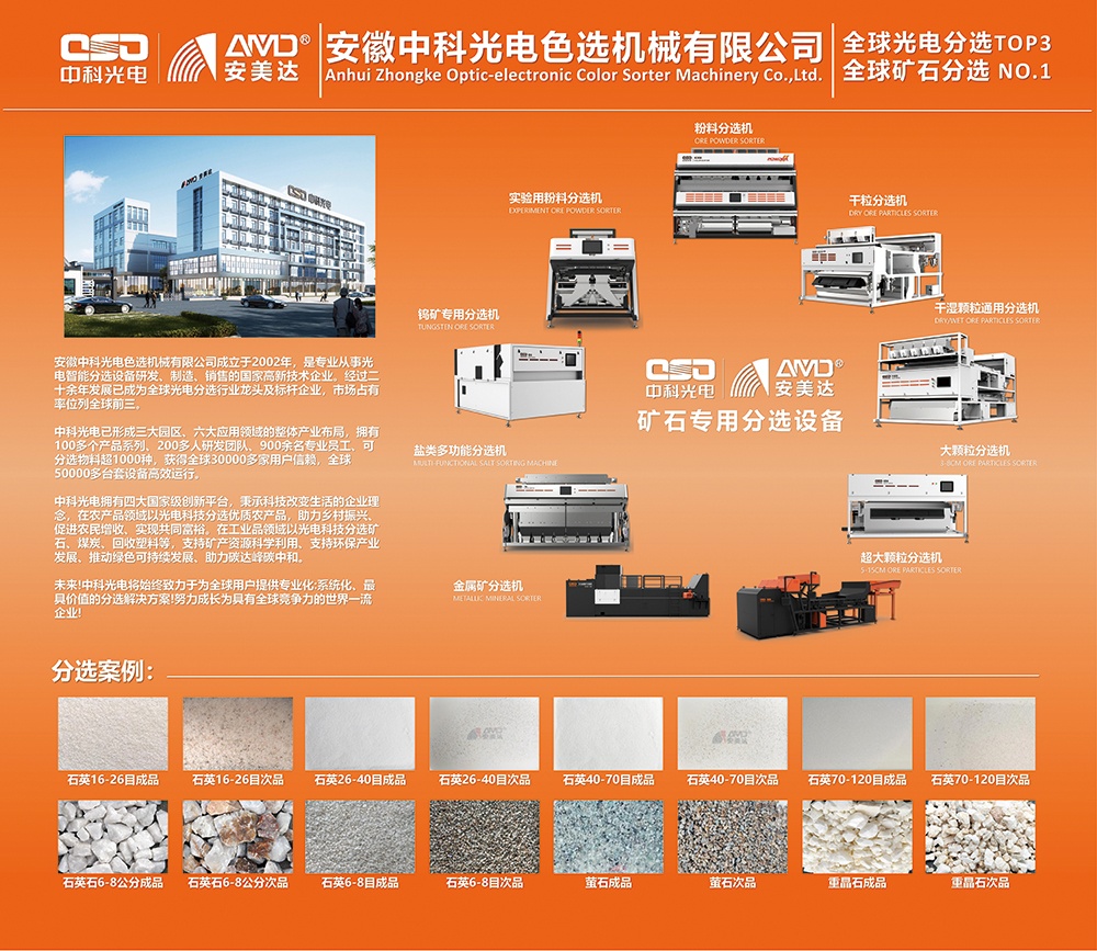 安徽中科光電色選機械有限公司坐落于中國合肥,占地面積15萬平方米,總投資4.5億,員工人數760多人,科研樓25000平方米,是一家專業從事智能分選設備研發、生產、銷售的高新技術企業。歷經十多年的發展,已成為擁有員工超600人,銷售收入逾5億元的大型智能分選設備生產基地。