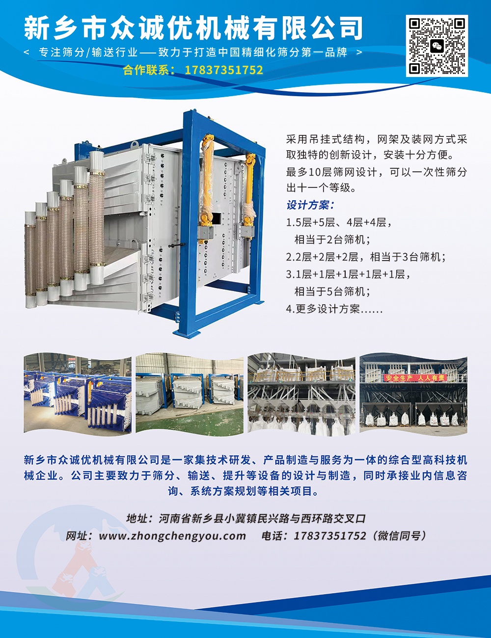 新鄉市眾誠優機械有限公司是一家集技術研發、產品制造與服務為一體的綜合型高科技機械企業。公司主要致力于篩分、輸送、提升等設備的設計與制造,同時承接業內信息咨詢、系統方案規劃等相關項目。