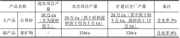 因市場對烘干石英砂的需求增大,干砂市場好,且濕砂瀝干占地面積大,效率低,易受天氣因素影響,企業為提高生產效率,于2021年12月進行擴建,擴建項目主要建設1條洗砂線、2條烘干篩分線、1條配砂線設備及相關配套環保設施等,原料來源于外購及現有項目篩出的廢石,不涉及開采活動。