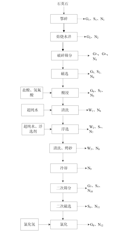 其中,高純石英砂生產(chǎn)工藝流程為鄂碎、焙燒水淬、篩分、磁選、酸浸、清洗、色選、浮選、清洗、烤砂、冷卻、二次篩分、二次磁選、氯化。
