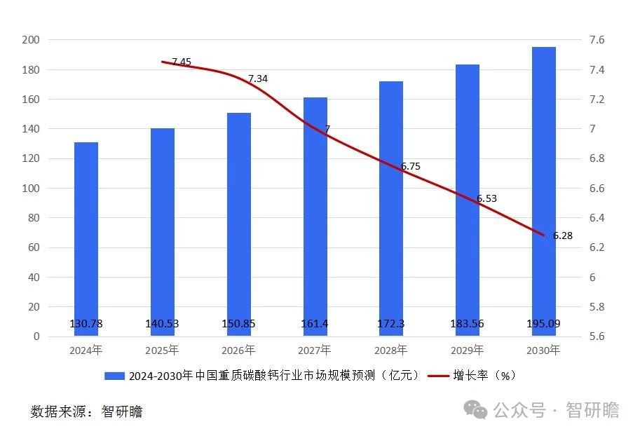 據智研瞻預測,2024-2030年中國重質碳酸鈣行業市場規模增長率在6%-8%,2030年中國重質碳酸鈣行業市場規模195.09億元,同比增長6.28%。