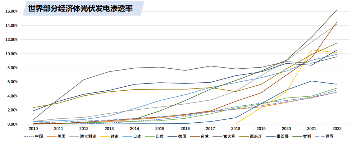 2023年,我國(guó)光伏產(chǎn)業(yè)規(guī)模持續(xù)擴(kuò)大,多晶硅、硅片、電池、組件等主要制造環(huán)節(jié)產(chǎn)量同比增長(zhǎng)均超過(guò)64%,行業(yè)總產(chǎn)值超過(guò)1.75萬(wàn)億元。目前,世界主要經(jīng)濟(jì)體光伏滲透率不斷提升,特別是近五年增速較快,2022年世界平均光伏發(fā)電滲透率約為4.54%。中美滲透率與世界平均水平較為接近,分別為4.83%和4.53%,但存在較大提升空間,光伏產(chǎn)業(yè)未來(lái)需求仍是不可估量的。