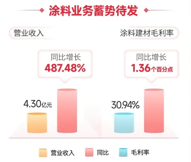 北新建材2024年第一季度營業收入同比大幅增長24.62%,除了石膏板、防水材料業務產品銷量增加外,預計還跟嘉寶莉有關。北新建材此前發布公告稱,2023年底公司對嘉寶莉實現聯合重組,補強涂料翼;同時嘉寶莉于2024年2月29日正式并表。根據北新建材官微發布的文章顯示,涂料建材業務2024年第一季度營業收入為4.3億元,同比大幅增長487.48%;毛利率為30.94%,同比增加1.36個百分點。