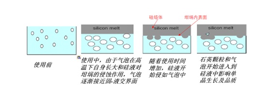 在石英坩堝成型過程中,由于溫度極高,石英表面液體包裹體會吸收膨脹,使坩堝表面充滿氣泡裂紋,影響到坩堝質量。石英坩堝的內壁因為與硅熔體接觸,在高溫狀態下,若內壁存在氣泡,氣泡會導致氣體和雜質從坩堝內釋放到熔體中從而擾亂到單晶硅的生長。
