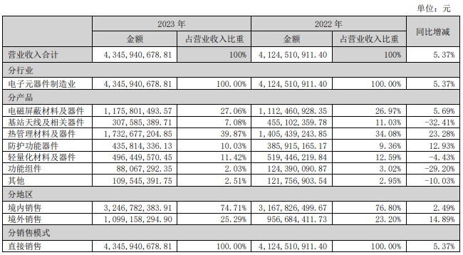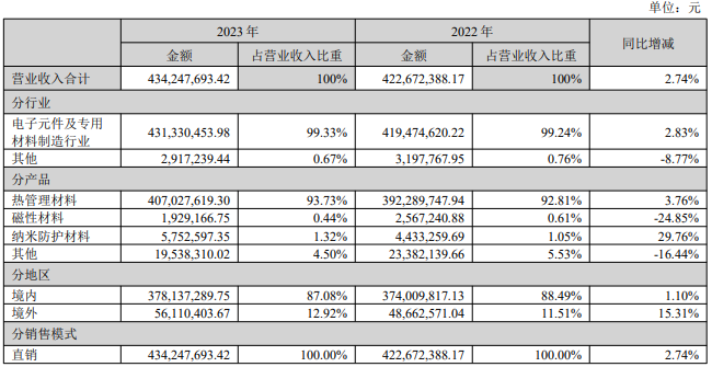 2023年,終端產品需求的下滑,給公司短期業績增長帶來壓力。2023 年北美大客戶新機型單機散熱材料需求較上一代機型用量下降,且競爭加劇,導致公司銷售收入和盈利能力階段性承壓。報告期內,公司實現營業收入12.58 億元,同比下降 20.99%,實現歸母凈利潤 7,375.65 萬元,同比下降 61.87%。