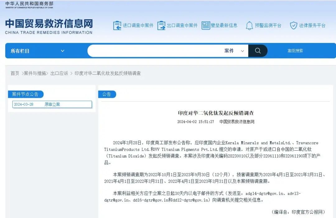 2024年3月28日,印度商工部發布公告稱,應印度主要鈦白粉生產廠家Kerala Mineralsand MetalsLtd.、Travancore Titanium ProductsLtd.和VVTitanium PigmentsPvt.Ltd.提交的申請,對原產于或進口自中國的二氧化鈦(Titanium Dioxide)發起反傾銷調查。