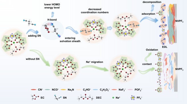 為了提高NVPF3基鈉離子電池的高壓穩(wěn)定性,團隊設(shè)計了一類含雙-C≡N極性基團添加劑的二腈類電解液體系,通過和頻共振光譜、原位電化學(xué)表面增強拉曼等表征方法和理論計算相結(jié)合。一方面,團隊揭示了添加劑中-C≡N基團與溶劑(-CH2/-CH3)之間形成分子間氫鍵,使得另一個-C≡N基團更易進(jìn)入溶劑鞘內(nèi)層,降低溶劑配位數(shù),從而減少了溶劑與正極界面接觸進(jìn)而發(fā)生氧化分解的作用機制,同時分子間氫鍵會降低電解液LUMO(Lowest Unoccupied Molecular Orbital)能級,從而提高電解液的抗氧化性。