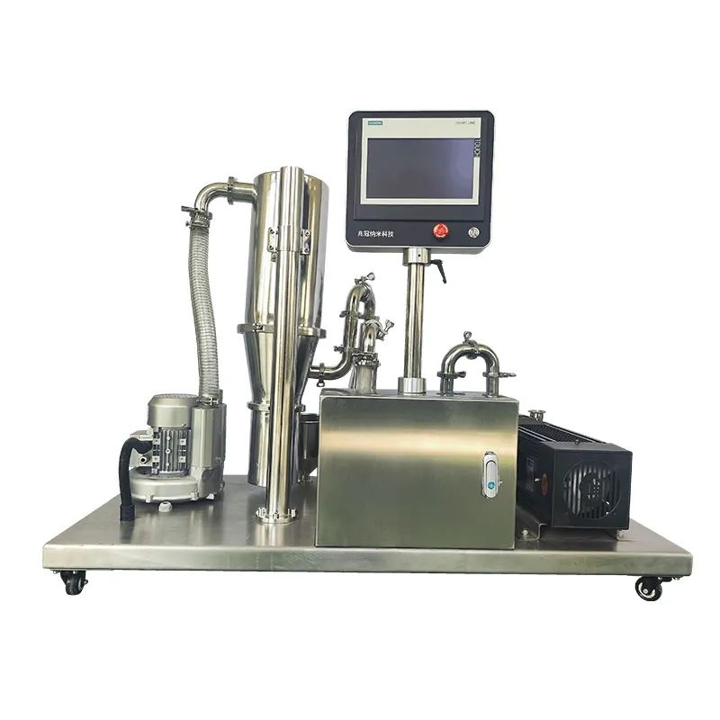 (1)、超音速氣流對撞使物料產品粒徑可達亞微米級,粉碎至1一5μm的超細顆粒,而且不粘壁,效率高。