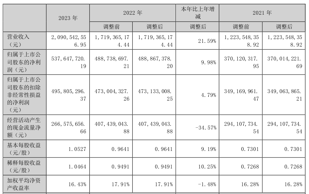 公司此前披露的2023年年報顯示,公司2023年實現營業收入20.91億元,同比增長21.59%;實現歸屬于上市公司股東的凈利潤5.38億元,同比增長9.98%。