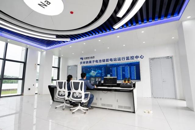 ▲在伏林鈉離子電池儲(chǔ)能電站主控樓里,技術(shù)人員通過(guò)電子大屏實(shí)時(shí)監(jiān)控儲(chǔ)能電站設(shè)備。