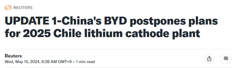 此前,據(jù)多家外媒報(bào)道,比亞迪美洲區(qū)負(fù)責(zé)人周二在接受路透社采訪時(shí)表示,智利生產(chǎn)電動(dòng)汽車電池用鋰陰極材料項(xiàng)目生產(chǎn)計(jì)劃暫時(shí)取消,公司已推遲到2025年。