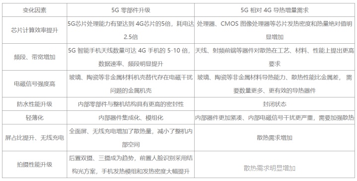 以5G手機為例,功能創新帶來功耗提升,散熱需求隨之升級。主要發熱源為處理器、電池、攝像頭、LED模組,5G手機需要支持更多的頻段和實現更復雜的功能,天線數量翻倍,射頻前端增加,處理器性能提升,同時智能手機向大屏折疊屏、多攝高清攝升級、大功率快充升級,使得手機內集成的功能模塊更多更緊密。5G手機芯片功耗約11W,約是4G手機的2.5倍,散熱需求強烈。目前4G廣泛應用的散熱材料有石墨片、導熱界面材料等,受制于其導熱系數的極限,已經很難滿足5G手機需求。