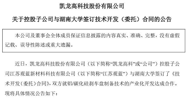 中國粉體網訊 5月20日,凱龍高科技股份有限公司(凱龍高科)公告,旗下致力于高端碳化硅新材料的研發和產業化的控股子公司江蘇觀藍新材料科技有限公司(江蘇觀藍)與湖南大學簽訂《技術開發(委托)合同》,雙方就鋁/碳化硅剎車盤制備技術的產業化開發達成合作,合同總金額為300萬元。