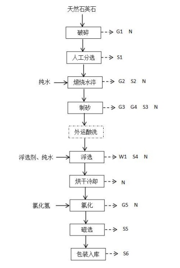 擬建項目光伏、半導(dǎo)體坩堝中外層高純石英砂生產(chǎn)工藝流程及產(chǎn)污環(huán)節(jié)圖