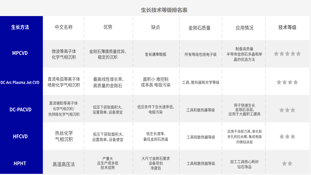 高品質(zhì)、大顆粒,是對培育鉆石企業(yè)在工藝水平與質(zhì)控能力上的最高要求,也是企業(yè)技術(shù)研發(fā)實力的核心競爭壁壘。當(dāng)前,全球培育鉆石的生產(chǎn)方法主要有高溫高壓法(HPHT)和微波等離子體(MPCVD)兩種。MPCVD和HPHT相比,在大顆粒、高凈度方面更具有優(yōu)勢。
