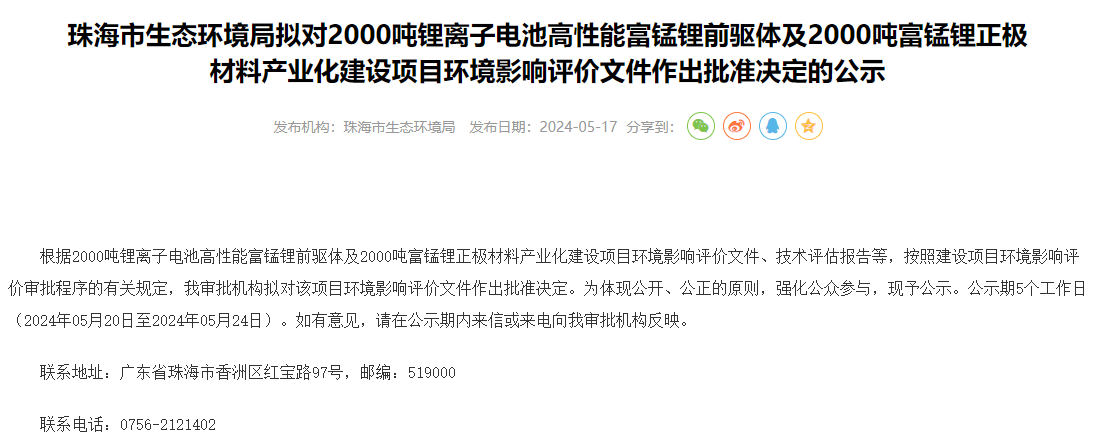 中國粉體網訊 近日,廣東珠海市生態環境局擬對珠海冠啟新材料有限公司2000噸鋰離子電池高性能富錳鋰前驅體及2000噸富錳鋰正極材料產業化建設項目環境影響評價文件作出批準決定的公示。