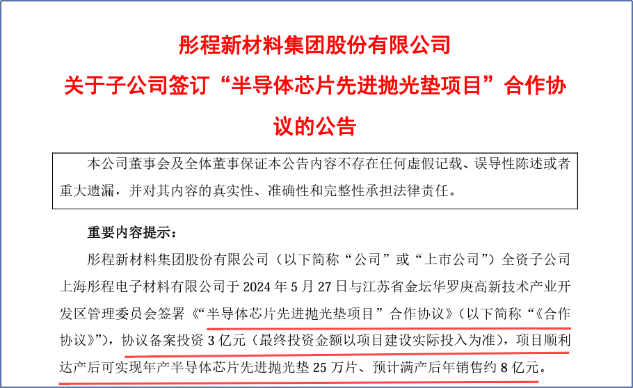 “半導體芯片先進拋光墊項目”協議備案投資3億元,擬在華羅庚高新區內新建半導體芯片拋光墊生產基地,主要從事半導體芯片拋光墊的研發、生產和銷售,項目順利達產后可實現年產半導體芯片先進拋光墊25萬片、預計年銷售約8億元。
