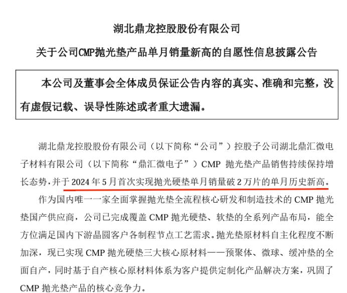 中國粉體網訊 6月6日,鼎龍股份發布公告,其控股子公司鼎匯微電子CMP拋光墊產品銷售持續保持增長態勢,并于2024年5月首次實現拋光硬墊單月銷量破2萬片的單月歷史新高。