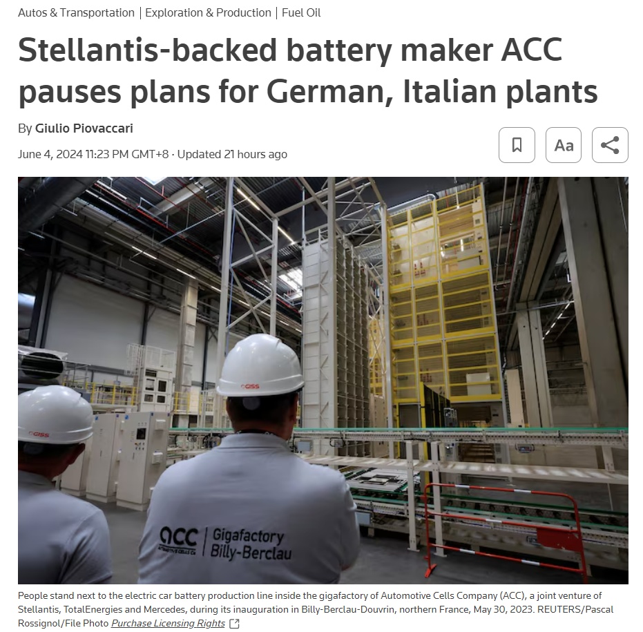 6月4日,歐洲車(chē)企Stellantis、梅賽德斯-奔馳集團(tuán)和道達(dá)爾能源的合資電池企業(yè)ACC宣布,暫停歐洲兩家電動(dòng)汽車(chē)電池廠的建設(shè),鑒于市場(chǎng)對(duì)仍然昂貴的電動(dòng)汽車(chē)的需求放緩,它們可能會(huì)轉(zhuǎn)而生產(chǎn)成本較低的電池。據(jù)此前規(guī)劃,ACC計(jì)劃在歐洲建設(shè)運(yùn)營(yíng)三家超級(jí)電池工廠,計(jì)劃總投資70億歐元(約552億元人民幣),產(chǎn)能分別為40GWh,共計(jì)120GWh。據(jù)悉目前法國(guó)北部工廠正在產(chǎn)能爬升階段,此次是位于意大利和德國(guó)工廠建設(shè)和籌備暫時(shí)暫停。