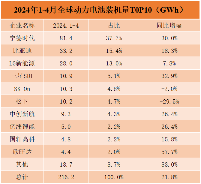 4月全球動(dòng)力電池裝車(chē)量出爐
