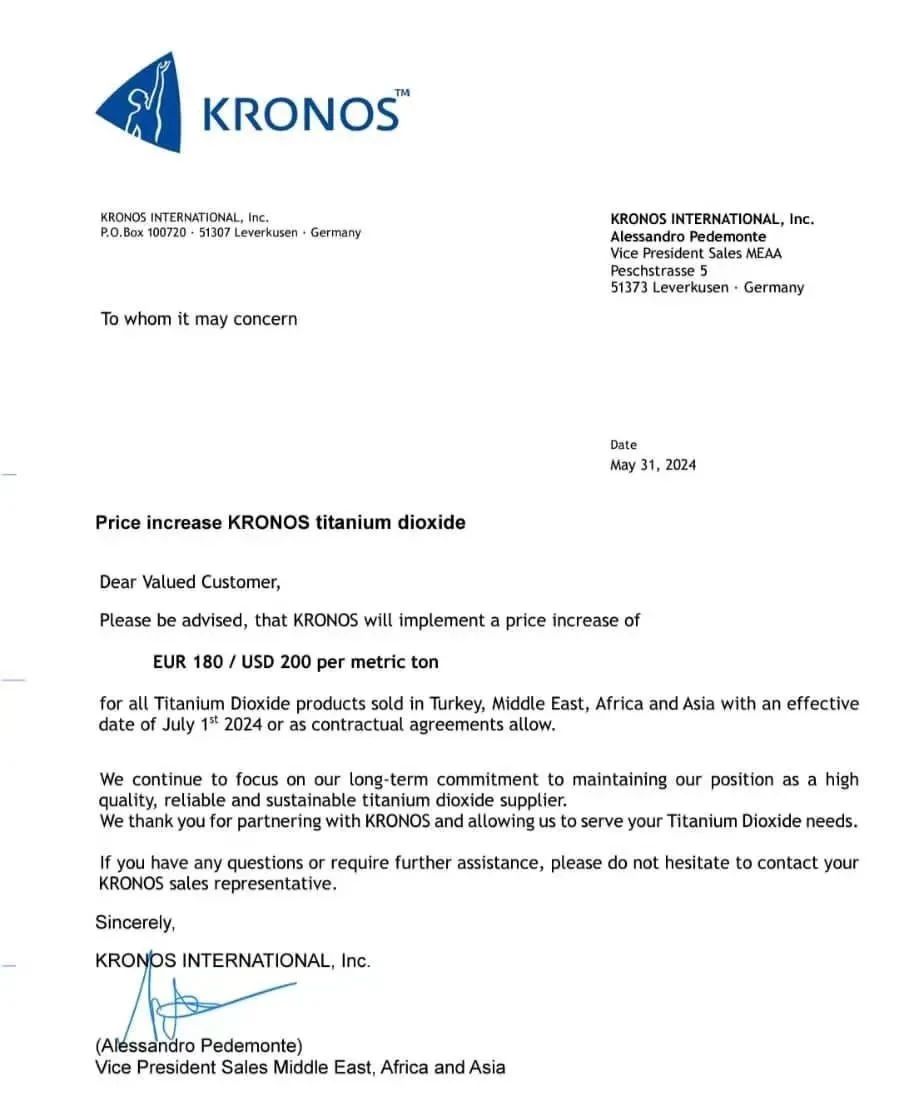近日康諾斯(Kronos)宣布,2024年7月1日起,土耳其、中東、非洲和亞洲銷售的所有二氧化鈦(鈦白粉)產品,上調180歐元/噸或200美元/噸,或另見合同約定。