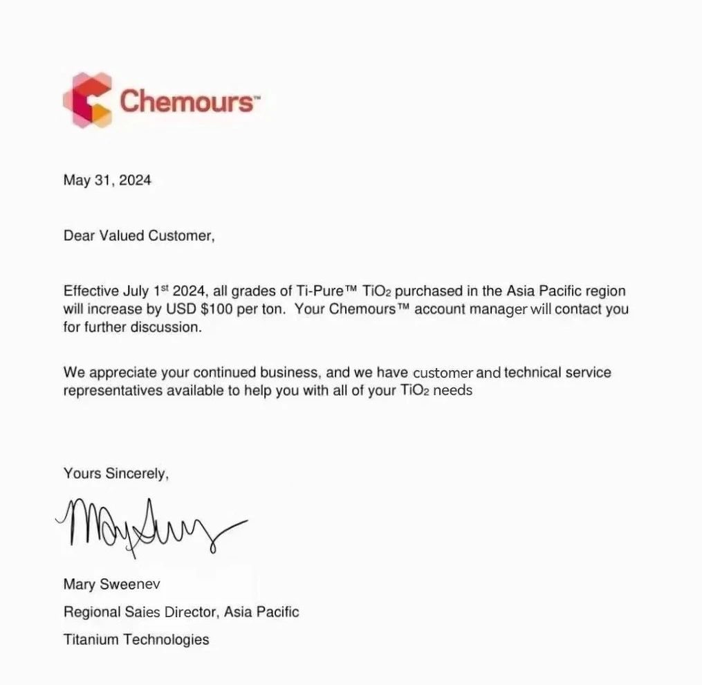 在5月31日,科慕宣布將于7月1日起,所有規格的Ti-Pure™在亞太地區購買的Tio2每噸將增加100美元。
