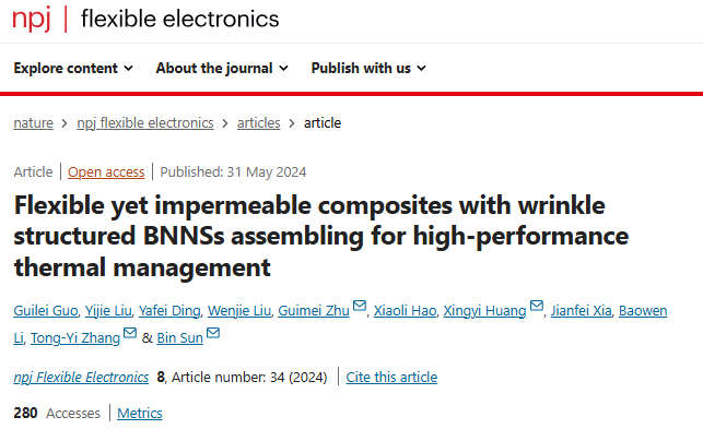 近日,青島大學孫彬教授聯合香港科技大學張統一院士、上海交通大學黃興溢教授、南方科技大學朱桂妹研究員在Nature子刊《npj Flexible Electronics》,發表了最新研究成果“Flexible yet impermeable composites with wrinkle structured BNNSs assembling for high-performance thermal management”。