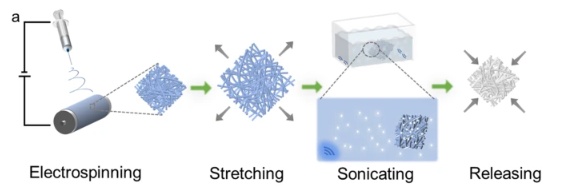 研究者使用靜電紡絲結合超聲的方法,先將氮化硼納米片(BNNS)沉積到預拉伸TPU電紡纖維上,在纖維膜預應力釋放之后,纖維恢復到初始狀態,而BNNSs則會隨著纖維回縮自發形成緊密搭連的雙軸褶皺結構。