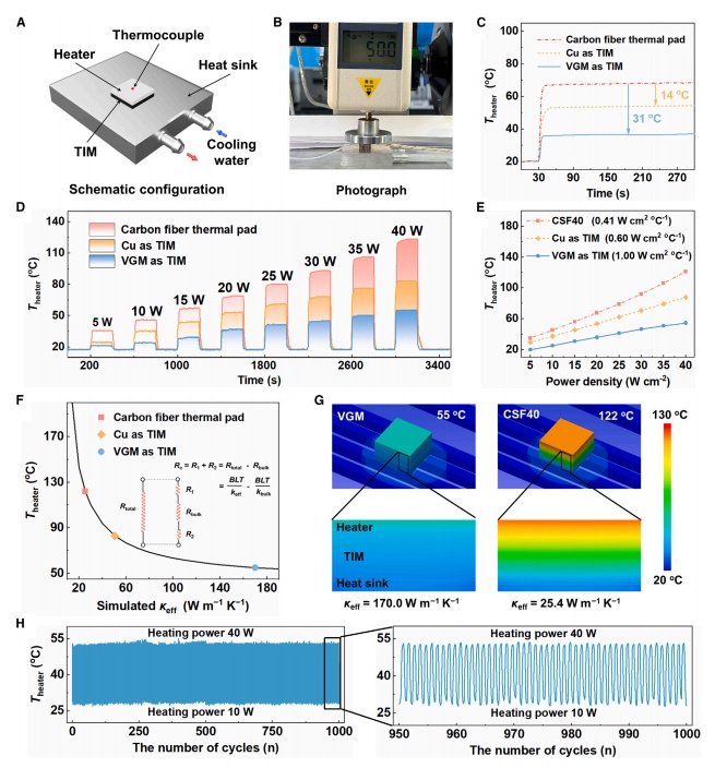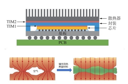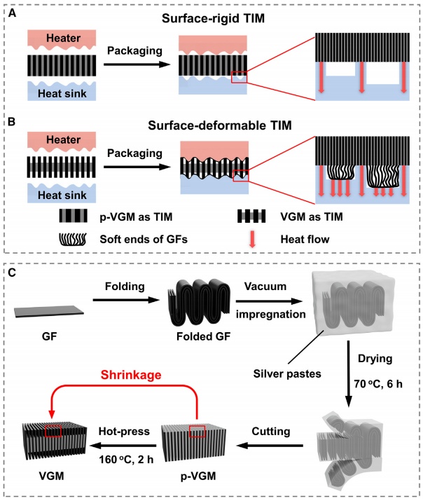通常,在發熱的元件和散熱器中間填充熱界面材料(TIMs),可以在兩個表面形成良好接觸,驅除其間熱導率較低的空氣,從而實現較好的散熱效果。TIMs需要具有優異的可壓縮性和適當的厚度,以滿足器件設計和制造公差的要求,同時也能夠符合粗糙的裝配表面,以減少界面熱阻。然而,由于散熱性能有限,現有的商用TIMs無法滿足功率密度顯著增加的器件的需求。