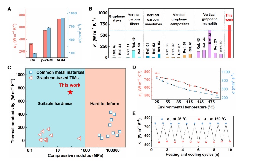 近日,武漢理工何大平、王哲團隊針對用于高效散熱的TIMs的開發取得最新進展。在這項工作中,基于垂直石墨烯單體(VGMs)內銀漿的體積收縮,實現了超高kt (738.6 W/mK)和低r接觸(29.2 Kmm2/W)的TIMs。出色的kt來自垂直排列的石墨烯薄膜(GFs),具有出色的面內導熱性。此外,GFs之間的銀漿加熱后會收縮,導致GFs軟端暴露,形成可變形的表面,從而實現r接觸的顯著降低。此外,受益于GFs的高面內導熱系數,所得VGM TIMs在熱管理測試中顯示出優越的散熱效率,分別比Cu和最先進的商用TIMs高66.7%和143.9%。與最先進的TIMs相比,VGM TIMs的散熱效率提高了~2.44倍。該研究結果為先進的TIMs和熱管理應用提供了實用的設計指南。研究成果以“Deformable surface design of vertical graphene thermal interface materials for efficient heat dissipation”為題發表在《Cell Reports Physical Science》。