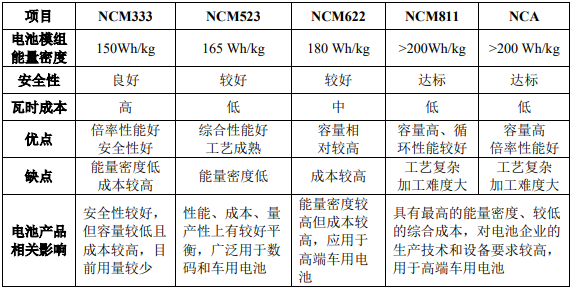 按照鎳、鈷、錳(鋁)的大致構成比例,三元正極材料可以分為NCM333、NCM523、NCM622、NCM811、NCA等型號,能量密度會隨著鎳含量的提高而提升。