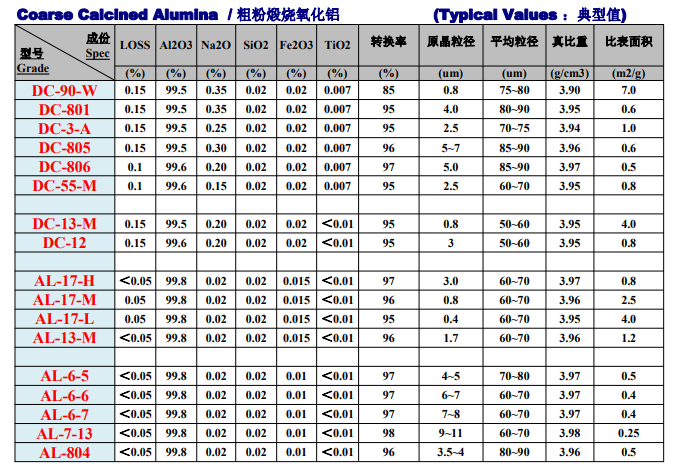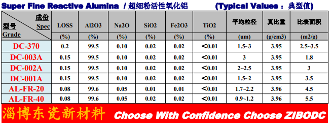東瓷新材料煅燒氧化鋁產品型號指標一覽