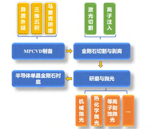 應用于半導體領域或是集成電路的金剛石需要具備一定的形狀和面型精度,從半導體用大尺寸單晶金剛石襯底的常規制備工藝流程中可見晶體的微波等離子體化學氣相沉積(MPCVD)制備、晶圓切割和研磨拋光是單晶金剛石襯底制備過程的關鍵工序。