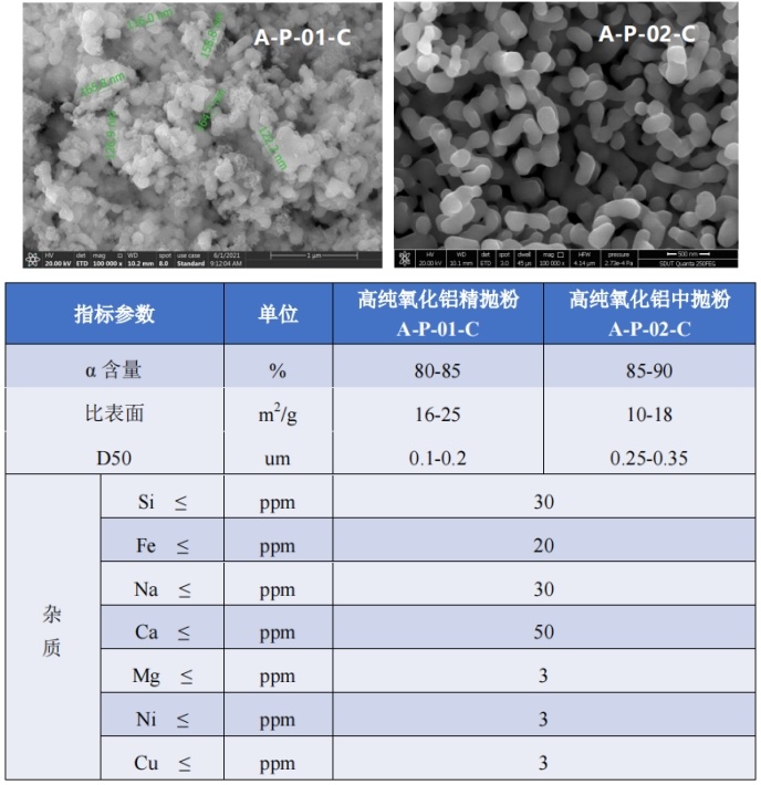 以拋光用高純氧化鋁為例,事業部采用自主研發的全新綠色生產工藝生產的CMP精密拋光用高純氧化鋁,具有粒徑分布窄、無結塊、粒度均一、細粒子與大顆粒控制嚴格,晶相穩定、形貌規則、分散性和吸附性好、硬度與密度適中等特點,可以根據客戶要求提供不同原晶尺寸、形貌、比表面、粒度和晶型的定制化產品。可滿足光學鏡頭、光學玻璃、光學鏡片、碳化硅晶圓、集成電路、半導體芯片、藍寶石、稀貴金屬、鋁合金、不銹鋼、陶瓷器件、消費電子、工業電子、車漆及內飾、塑料等領域的拋光需求。