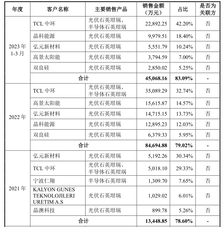 2021年,2020年,2023年1-3月,美晶新材來自前五大客戶的銷售收入占主營業務收入的比重分別為78.60%、79.02%和82.24%,存在客戶集中度較高的風險。2022年、2023年,TCL中環都是公司第一大客戶,2021年為第二大客戶,若公司的主要客戶經營狀況、市場競爭地位出現重大不利變化,將會影響主要客戶對公司的采購需求,對公司的銷售收入產生不利影響。