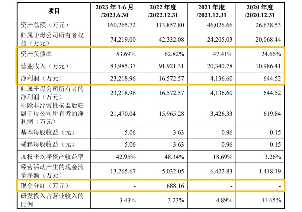 值得注意的是,公司經營活動產生的現金流量凈額分別為1,418.19萬元、6,422.83萬元、-5,032.05萬元和-13,265.67萬元。2022年、2023年1-6月公司經營活動產生的現金流量凈額為負,資金需求增加,發行人解釋,主要原因為報告期內公司經營規?焖偕仙,導致運營資金需求規?焖僭黾。