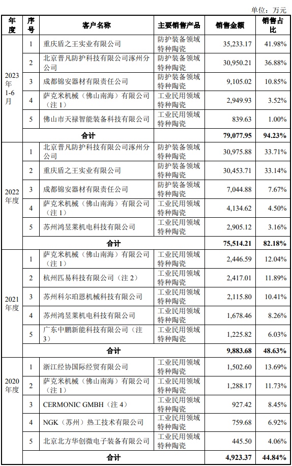 2022年度和2023年1-6月,公司獲取北京普凡、成都錦安、重慶盾之王等客戶碳化硼陶瓷板大額訂單,導致客戶集中度相對較高,這三家大客戶還間接導致公司的主營產品賽道發生變化。