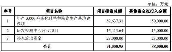 本次申請上市,公司原計劃募集資金8.8億元,用于年產3000噸碳化硅特種陶瓷生產基地建設項目、研發檢測中心建設項目、補充流動資金。